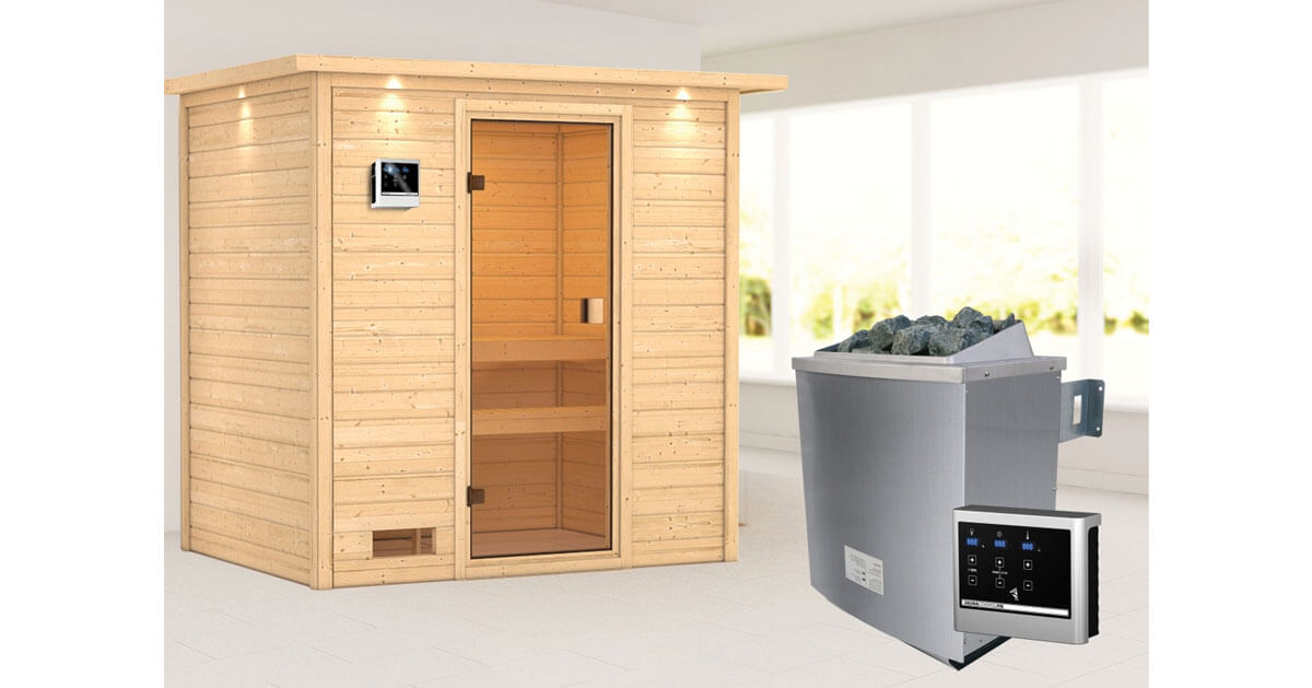 Karibu 38mm Massivholzsauna Selena mit Dachkranz + 9kW Saunaofen mit ext. Steuerung Easy
