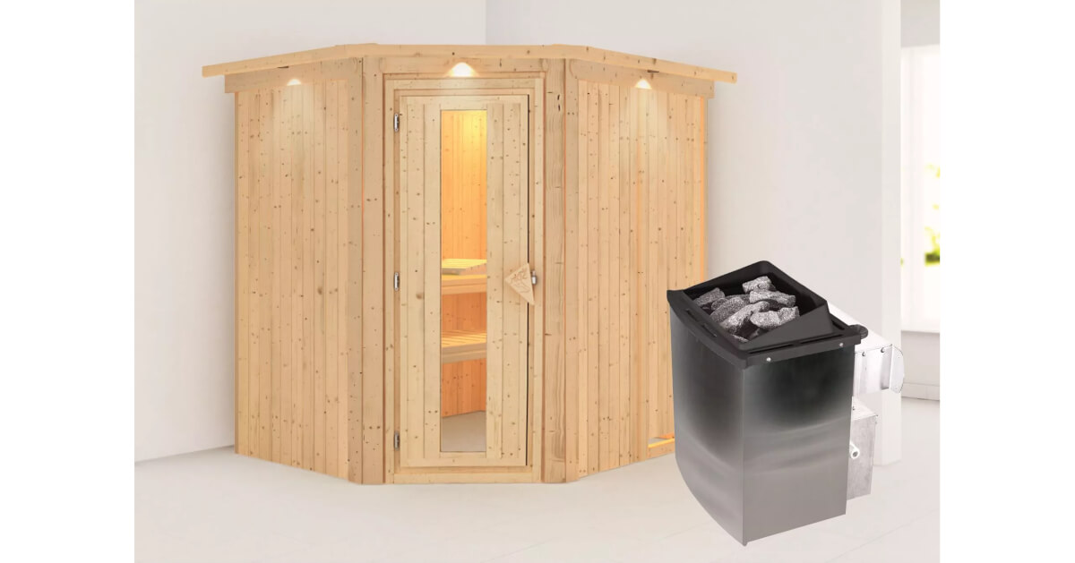 2 stabile Liegen aus Massivholz, 9kW Saunaofen mit integrierter Steuerung, Ofenschutzgitter, Montageanleitung