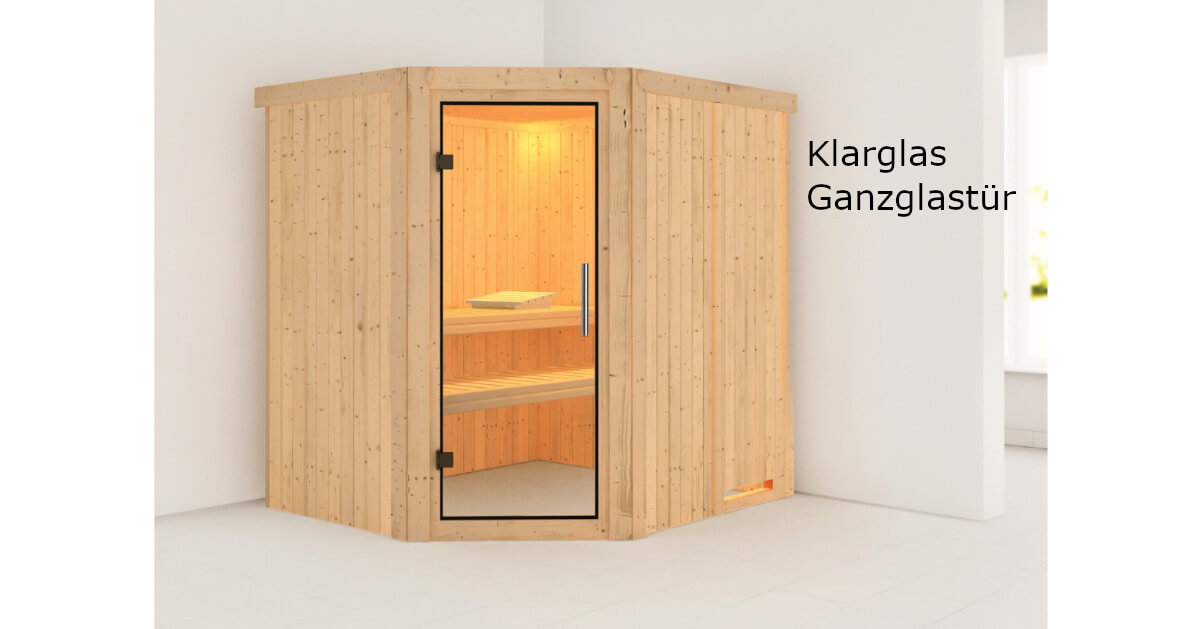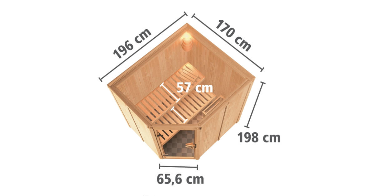 Sparen Sie wertvolle Energie mit der Systemsauna Siirin. Eine 68mm starke Konstruktion, bestehend aus einer Rahmenkonstruktion mit 42mm starker Mineraldämmwolle und einer Verkleidung an der Sichtseite aus 12,5mm Spezial-Softline-Profilholz, hält die Wärme optimal im Saunainneren. Die Decke besteht aus einer 57mm starken Spezialplatte mit Mineraldämmwolle. Die Außenmaße ohne Dachkranz betragen 196 x 170 x 198cm (B/T/H). Die Sauna verfügt über 2 Saunabänke aus Espenholz zum Entspannen und Wohlfühlen. Mit einem optional erhältlichen 4,5kW-Saunaofen bringen Sie das Innere schnell auf Temperatur. Bei dem Ofen können Sie zwischen einer Variante mit integrierter Steuerung, einer Variante mit externer Steuerung oder einem 4,5kW Bio-Kombiofen wählen. So ist garantiert für jeden das Richtige dabei. Durch einen optionalen Dachkranz inkl. drei LED-Spots können Sie Ihre Sauna von außen beleuchten und sie so perfekt in Szene setzen. In den Innenraum gelangen Sie durch eine Saunatür. Hier können Sie sich zwischen vier möglichen Varianten entscheiden. Egal ob klassisch mit bronziertem Glas, modern mit graphitfarbenem Glas, schlicht mit klarem Türglas oder passend mit einer energiesparenden, wärmegedämmten Holztür mit klarem Isolierglas. Durch die vorgefertigten Wand und Deckenelemente wird Ihnen ein einfacher Aufbau ermöglicht. Passen Sie die Sauna auf Ihre Bedürfnisse an mit unserem optional erhältlichen Zubehör. Eine ergonomische Kopfstütze für den optimalen Liegekomfort, eine ergonomische Rückenlehne zur perfekten Entspannung oder eine Saunaleuchte modern für das richtige Ambiente. Genießen Sie die Ruhe nach einem anstrengenden Arbeitstag bei einem ausgiebigen Saunagang und erholen Sie sich vom Alltag. Verringern Sie den Energieverbrauch beim Saunieren mit der 68mm Systemsauna Siirin.