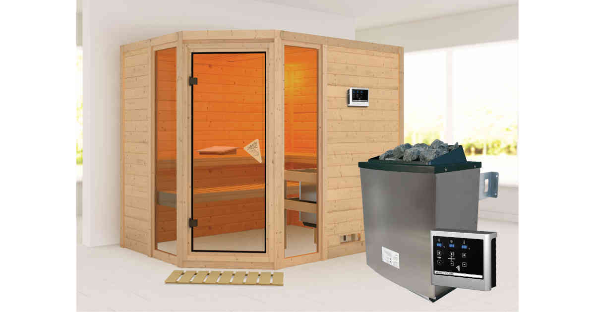 Karibu 38mm Systemsauna Sinai 3 mit 9kW Saunaofen mit ext. Steuerung Easy