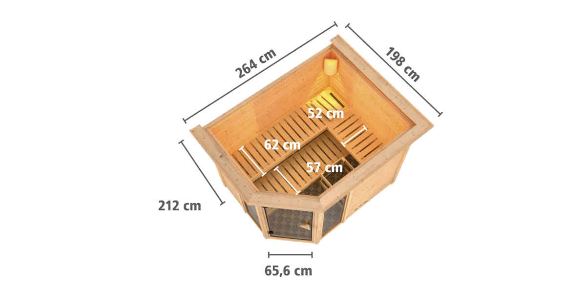 Ein Ort der Ruhe und Entspannung in den eigenen Vier Wänden. Nach einem stressigen Tag die Seele baumeln lassen und sich von der wohligen Wärme in einer Sauna verwöhnen ohne das Haus verlassen zu müssen. Dies ist möglich mit unserer 38mm Massivholzsauna Sinai 3. Die stabile Konstruktion mit 38mm Bohlen aus nordischem Fichtenholz wird im einfachen Steck-/ Schraubsystem montiert. Durch die massiven Vollholzwände wird im Saunainneren ein ideales Raumklima nach finnischem Vorbild geschaffen. Ein optional wählbarer Dachkranz inkl. 3 LED-Spots setzt die Sauna gekonnt in Szene. Das Innere der Sauna erreichen Sie durch eine bronzierte Ganzglastür aus Einscheibensicherheitsglas mit Karibu-Türgriff. Durch die Tür und die beiden bronzierten Fenster gelangt Licht in den Innenraum und sorgt durch die bronzierten Gläser für ein warmes Ambiente. Mit einem Außenmaß von 236 x 184 x 209 cm (H/B/T) besitzt die Sauna Sinai 3 die ideale Größe zum Entspannen und Wohlfühlen. Erweitern Sie Ihre Möglichkeiten mit dem optional erhältlichen 9kW-Bio-Kombiofen. Neben einer klassischen finnischen Sauna haben Sie hier die Möglichkeit einer Kräuterdampf-Kur, einem Dampfbad und einer Familiensauna. So wird es zu einem Saunaerlebnis für die ganze Familie. Lassen Sie sich von der wohltuenden Wirkung des Saunabadens überzeugen. Bei regelmäßiger Anwendung fühlen Sie sich nicht nur deutlich entspannter. Zusätzlich wirkt es sich positiv auf den Stoffwechsel aus, verfeinert das Hautbild und unterstützt den Stressabbau. Um ein besonderes Sauna-Gefühl zu schaffen, wird die Sauna mit 3 Saunaliegen und einer Kopfstütze ausgestattet. Durch eine extra breite Saunaliege von 62cm Breite wird Ihnen ein besonders angenehmer Liegekomfort geboten. Ein Ofenschutzgitter schützt Sie vor Verbrennungen durch den Saunaofen. Mit einer optional erhältlichen Salzkristall Vital Sole oder der Salzkristall-Leuchte können Sie Ihre Atemwege befreien und wieder tief ein- und ausatmen. Genießen Sie die zahlreichen Vorteile des Saunieren und schaffe Sie einen Ort der Ruhe mit der MassivholzsaunaSinai 3.