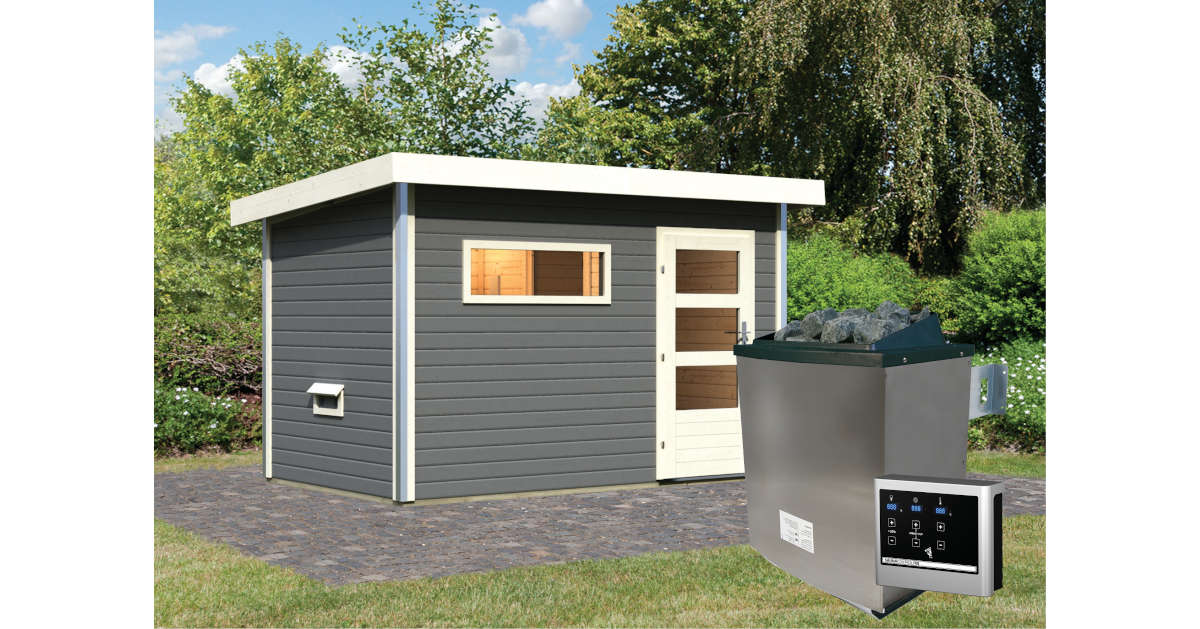 Karibu 38mm Saunahaus Skrollan 1 terragrau + 9 kW Saunaofen mit ext. Steuerung Easy