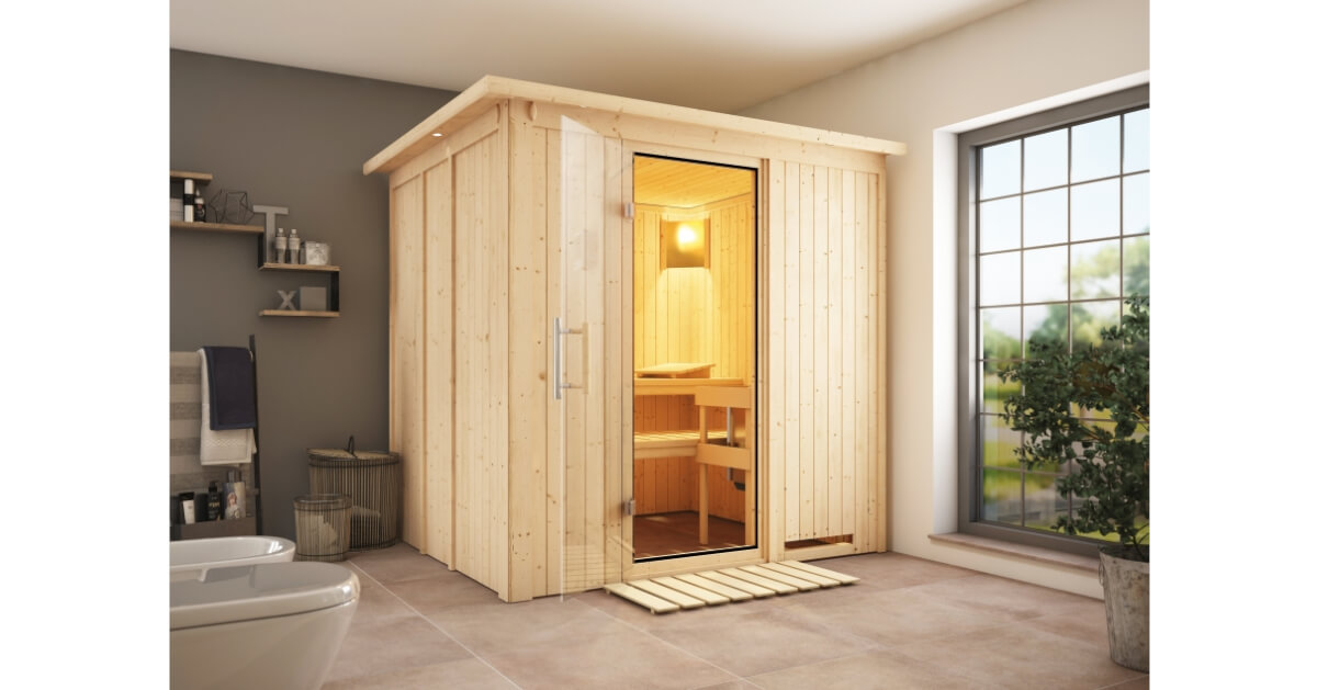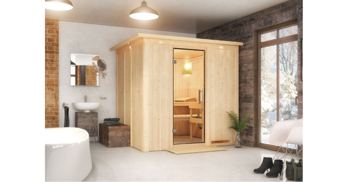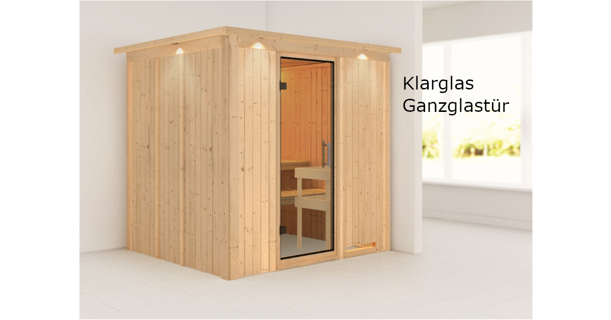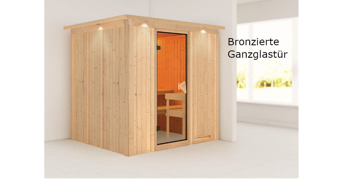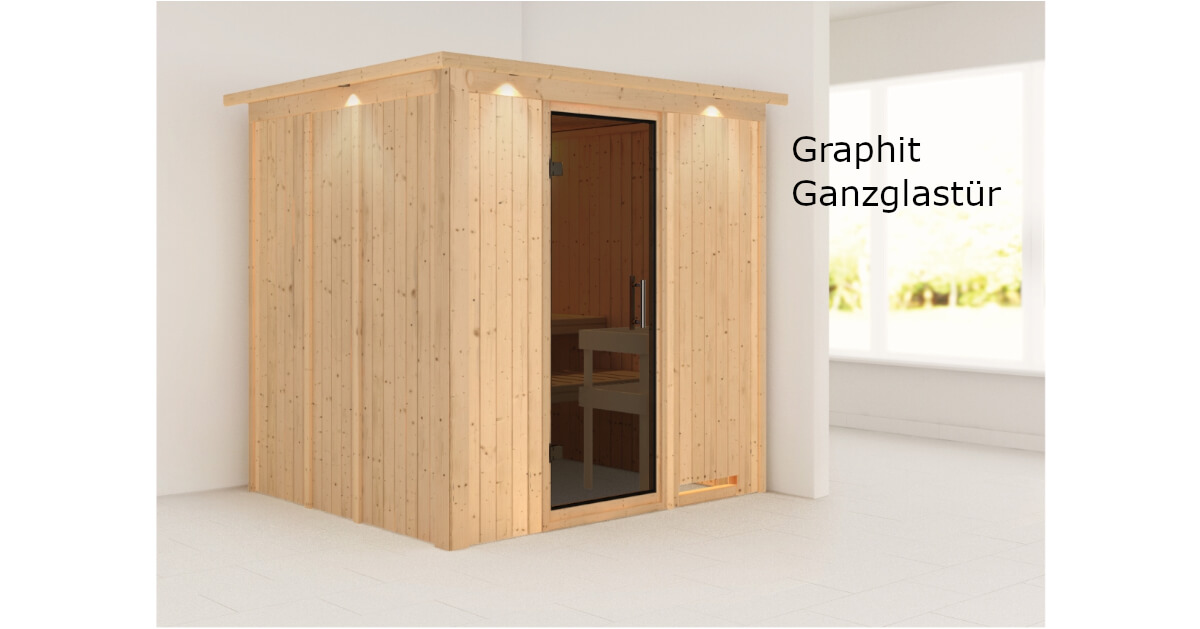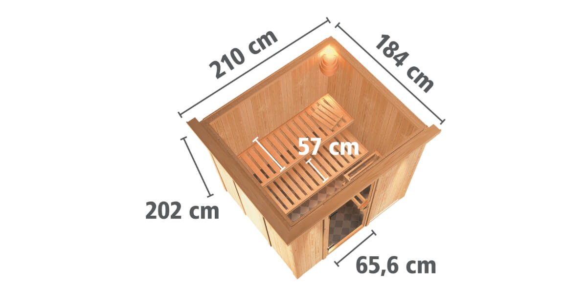 Sparen Sie wertvolle Energie mit der Systemsauna Sodin. Eine 68mm starke Konstruktion, bestehend aus einer Rahmenkonstruktion mit 42mm starker Mineraldämmwolle und einer Verkleidung an der Sichtseite aus 12,5mm Spezial-Softline-Profilholz, hält die Wärme optimal im Saunainneren. Die Decke besteht aus einer 57mm starken Spezialplatte mit Mineraldämmwolle. Die Außenmaße mit Dachkranz betragen 210 x 184 x 202 cm (B/T/H). Die Sauna verfügt über 2 Saunabänke aus Espenholz zum Entspannen und Wohlfühlen. Mit einem optional erhältlichen 4,5kW-Saunaofen bringen Sie das Innere schnell auf Temperatur. Bei dem Ofen können Sie zwischen einer Variante mit integrierter Steuerung, einer Variante mit externer Steuerung oder einem 4,5kW Bio-Kombiofen wählen. So ist garantiert für jeden das Richtige dabei. Durch einen optionalen Dachkranz inkl. drei LED-Spots können Sie Ihre Sauna von außen beleuchten und sie so perfekt in Szene setzen. In den Innenraum gelangen Sie durch eine Saunatür. Hier können Sie sich zwischen vier möglichen Varianten entscheiden. Egal ob klassisch mit bronziertem Glas, modern mit graphitfarbenem Glas, schlicht mit klarem Türglas oder passend mit einer energiesparenden, wärmegedämmten Holztür mit klarem Isolierglas. Durch die vorgefertigten Wand und Deckenelemente wird Ihnen ein einfacher Aufbau ermöglicht. Passen Sie die Sauna auf Ihre Bedürfnisse an mit unserem optional erhältlichen Zubehör. Eine ergonomische Kopfstütze für den optimalen Liegekomfort, eine ergonomische Rückenlehne zur perfekten Entspannung oder eine Saunaleuchte modern für das richtige Ambiente. Genießen Sie die Ruhe nach einem anstrengenden Arbeitstag bei einem ausgiebigen Saunagang und erholen Sie sich vom Alltag. Verringern Sie den Energieverbrauch beim Saunieren mit der 68mm Systemsauna Sodin.