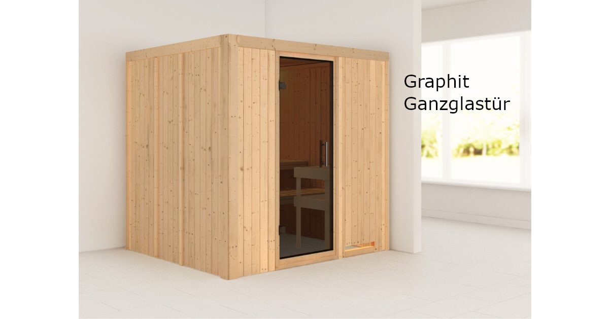 Sparen Sie wertvolle Energie mit der Systemsauna Sodin. Eine 68mm starke Konstruktion, bestehend aus einer Rahmenkonstruktion mit 42mm starker Mineraldämmwolle und einer Verkleidung an der Sichtseite aus 12,5mm Spezial-Softline-Profilholz, hält die Wärme optimal im Saunainneren. Die Decke besteht aus einer 57mm starken Spezialplatte mit Mineraldämmwolle. Die Außenmaße ohne Dachkranz betragen 196 x 170 x 198cm (B/T/H). Die Sauna verfügt über 2 Saunabänke aus Espenholz zum Entspannen und Wohlfühlen. Mit einem optional erhältlichen 4,5kW-Saunaofen bringen Sie das Innere schnell auf Temperatur. Bei dem Ofen können Sie zwischen einer Variante mit integrierter Steuerung, einer Variante mit externer Steuerung oder einem 4,5kW Bio-Kombiofen wählen. So ist garantiert für jeden das Richtige dabei. Durch einen optionalen Dachkranz inkl. drei LED-Spots können Sie Ihre Sauna von außen beleuchten und sie so perfekt in Szene setzen. In den Innenraum gelangen Sie durch eine Saunatür. Hier können Sie sich zwischen vier möglichen Varianten entscheiden. Egal ob klassisch mit bronziertem Glas, modern mit graphitfarbenem Glas, schlicht mit klarem Türglas oder passend mit einer energiesparenden, wärmegedämmten Holztür mit klarem Isolierglas. Durch die vorgefertigten Wand und Deckenelemente wird Ihnen ein einfacher Aufbau ermöglicht. Passen Sie die Sauna auf Ihre Bedürfnisse an mit unserem optional erhältlichen Zubehör. Eine ergonomische Kopfstütze für den optimalen Liegekomfort, eine ergonomische Rückenlehne zur perfekten Entspannung oder eine Saunaleuchte modern für das richtige Ambiente. Genießen Sie die Ruhe nach einem anstrengenden Arbeitstag bei einem ausgiebigen Saunagang und erholen Sie sich vom Alltag. Verringern Sie den Energieverbrauch beim Saunieren mit der 68mm Systemsauna Sodin.