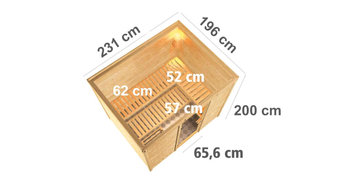 Ein Ort der Ruhe und Entspannung in den eigenen Vier Wänden. Nach einem stressigen Tag die Seele baumeln lassen und sich von der wohligen Wärme in einer Sauna verwöhnen ohne das Haus verlassen zu müssen. Dies ist möglich mit unserer 38mm Massivholzsauna Sonara. Die stabile Konstruktion mit 38mm Bohlen aus nordischem Fichtenholz wird im einfachen Steck-/ Schraubsystem montiert. Durch die massiven Vollholzwände wird im Saunainneren ein ideales Raumklima nach finnischem Vorbild geschaffen. Ein optional wählbarer Dachkranz inkl. 3 LED-Spots setzt die Sauna gekonnt in Szene. Wählen Sie eine von vier möglichen Türvarianten und passen Sie Ihre Sauna den eigenen Vorstellungen optimal an. Ob energiesparend mit einer Holztür mit Isolierglas, klassisch mit einer bronzierten Ganzglastür, modern mit einer Ganzglastür in graphitfarben oder schlicht mit einer klaren Ganzglastür. Hier ist garantiert das Richtige für Sie dabei. Mit einem Außenmaß von 236 x 184 x 209 cm (B/T/H) besitzt die Sauna Sonara die ideale Größe zum Entspannen und Wohlfühlen. Erweitern Sie Ihre Möglichkeiten mit dem optional erhältlichen 9kW-Bio-Kombiofen. Neben einer klassischen finnischen Sauna haben Sie hier die Möglichkeit einer Kräuterdampf-Kur, einem Dampfbad und einer Familiensauna. So wird es zu einem Saunaerlebnis für die ganze Familie. Lassen Sie sich von der wohltuenden Wirkung des Saunabadens überzeugen. Bei regelmäßiger Anwendung fühlen Sie sich nicht nur deutlich entspannter. Zusätzlich wirkt es sich positiv auf den Stoffwechsel aus, verfeinert das Hautbild und unterstützt den Stressabbau. Um ein besonderes Sauna-Gefühl zu schaffen, wird die Sauna mit Saunaliegen und einer Kopfstütze ausgestattet. Durch eine extra breite Saunaliege von 62cm Breite wird Ihnen ein besonders angenehmer Liegekomfort geboten. Ein Ofenschutzgitter schützt Sie vor Verbrennungen durch den Saunaofen. Mit einer optional erhältlichen Salzkristall Vital Sole oder der Salzkristall-Leuchte können Sie Ihre Atemwege befreien und wieder tief ein- und ausatmen. Genießen Sie die zahlreichen Vorteile des Saunieren und schaffe Sie einen Ort der Ruhe mit der Massivholzsauna Sonara.
