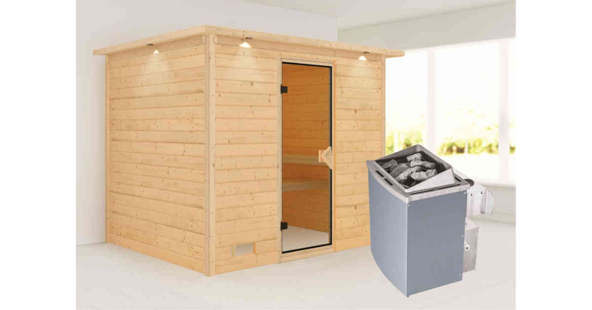 Ein Ort der Ruhe und Entspannung in den eigenen Vier Wänden. Nach einem stressigen Tag die Seele baumeln lassen und sich von der wohligen Wärme in einer Sauna verwöhnen ohne das Haus verlassen zu müssen. Dies ist möglich mit unserer 38mm Massivholzsauna Sonara. Die stabile Konstruktion mit 38mm Bohlen aus nordischem Fichtenholz wird im einfachen Steck-/ Schraubsystem montiert. Durch die massiven Vollholzwände wird im Saunainneren ein ideales Raumklima nach finnischem Vorbild geschaffen. Ein optional wählbarer Dachkranz inkl. 3 LED-Spots setzt die Sauna gekonnt in Szene. Wählen Sie eine von vier möglichen Türvarianten und passen Sie Ihre Sauna den eigenen Vorstellungen optimal an. Ob energiesparend mit einer Holztür mit Isolierglas, klassisch mit einer bronzierten Ganzglastür, modern mit einer Ganzglastür in graphitfarben oder schlicht mit einer klaren Ganzglastür. Hier ist garantiert das Richtige für Sie dabei. Mit einem Außenmaß von 236 x 184 x 209 cm (B/T/H) besitzt die Sauna Sonara die ideale Größe zum Entspannen und Wohlfühlen. Erweitern Sie Ihre Möglichkeiten mit dem optional erhältlichen 9kW-Bio-Kombiofen. Neben einer klassischen finnischen Sauna haben Sie hier die Möglichkeit einer Kräuterdampf-Kur, einem Dampfbad und einer Familiensauna. So wird es zu einem Saunaerlebnis für die ganze Familie. Lassen Sie sich von der wohltuenden Wirkung des Saunabadens überzeugen. Bei regelmäßiger Anwendung fühlen Sie sich nicht nur deutlich entspannter. Zusätzlich wirkt es sich positiv auf den Stoffwechsel aus, verfeinert das Hautbild und unterstützt den Stressabbau. Um ein besonderes Sauna-Gefühl zu schaffen, wird die Sauna mit Saunaliegen und einer Kopfstütze ausgestattet. Durch eine extra breite Saunaliege von 62cm Breite wird Ihnen ein besonders angenehmer Liegekomfort geboten. Ein Ofenschutzgitter schützt Sie vor Verbrennungen durch den Saunaofen. Mit einer optional erhältlichen Salzkristall Vital Sole oder der Salzkristall-Leuchte können Sie Ihre Atemwege befreien und wieder tief ein- und ausatmen. Genießen Sie die zahlreichen Vorteile des Saunieren und schaffe Sie einen Ort der Ruhe mit der Massivholzsauna Sonara.