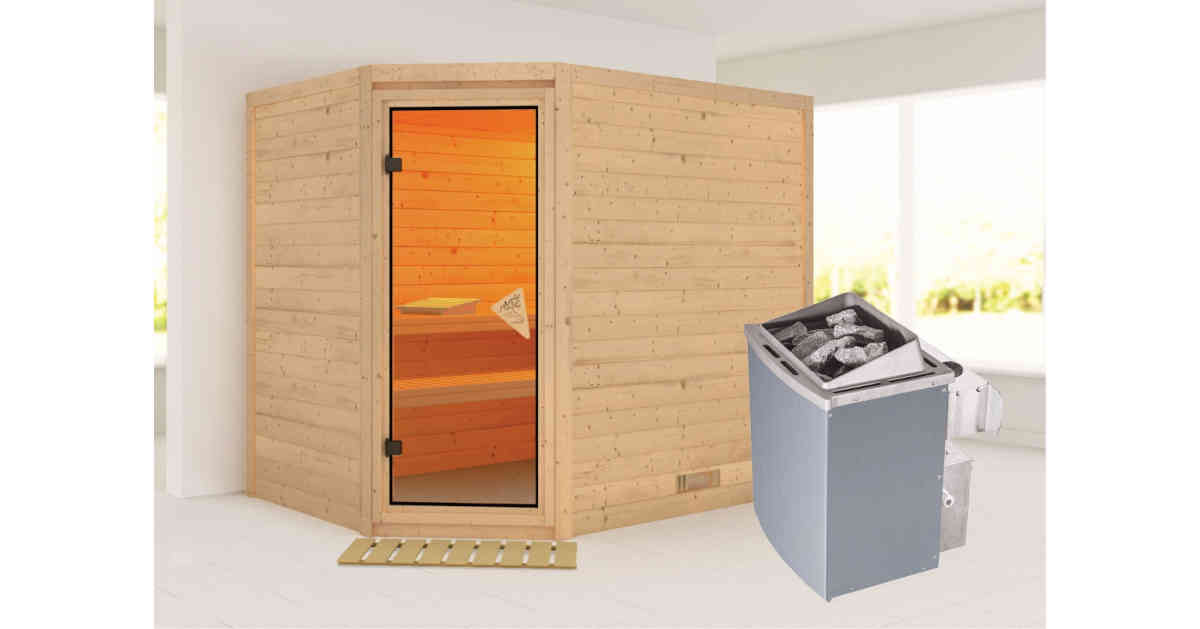 3 stabile Liegen aus Massivholz, 9kW Saunaofen mit integrierter Steuerung, Ofenschutzgitter, Montageanleitung