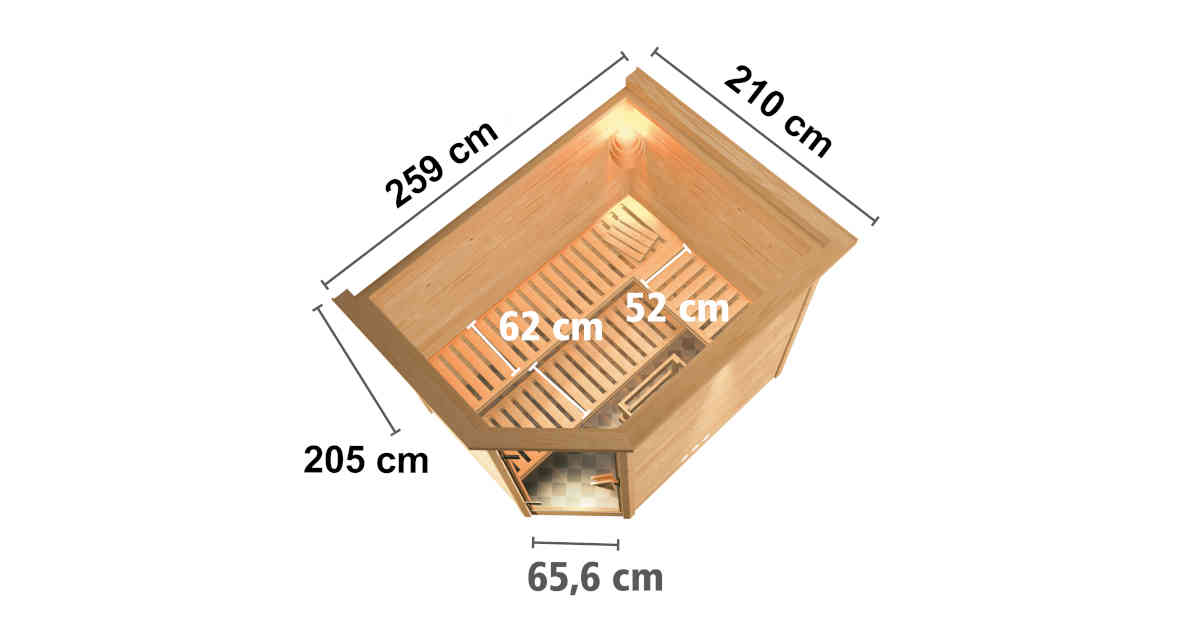Ein Ort der Ruhe und Entspannung in den eigenen Vier Wänden. Nach einem stressigen Tag die Seele baumeln lassen und sich von der wohligen Wärme in einer Sauna verwöhnen ohne das Haus verlassen zu müssen. Dies ist möglich mit unserer 38mm Massivholzsauna Tanami. Die stabile Konstruktion mit 38mm Bohlen aus nordischem Fichtenholz wird im einfachen Steck-/ Schraubsystem montiert. Durch die massiven Vollholzwände wird im Saunainneren ein ideales Raumklima nach finnischem Vorbild geschaffen. Ein optional wählbarer Dachkranz inkl. 3 LED-Spots setzt die Sauna gekonnt in Szene. Wählen Sie eine von vier möglichen Türvarianten und passen Sie Ihre Sauna den eigenen Vorstellungen optimal an. Ob energiesparend mit einer Holztür mit Isolierglas, klassisch mit einer bronzierten Ganzglastür, modern mit einer Ganzglastür in graphitfarben oder schlicht mit einer klaren Ganzglastür. Hier ist garantiert das Richtige für Sie dabei. Mit einem Außenmaß von 231 x 196 x 200 cm (B/T/H) besitzt die Sauna Tanami die ideale Größe zum Entspannen und Wohlfühlen. Erweitern Sie Ihre Möglichkeiten mit dem optional erhältlichen 9kW-Bio-Kombiofen. Neben einer klassischen finnischen Sauna haben Sie hier die Möglichkeit einer Kräuterdampf-Kur, einem Dampfbad und einer Familiensauna. So wird es zu einem Saunaerlebnis für die ganze Familie. Lassen Sie sich von der wohltuenden Wirkung des Saunabadens überzeugen. Bei regelmäßiger Anwendung fühlen Sie sich nicht nur deutlich entspannter. Zusätzlich wirkt es sich positiv auf den Stoffwechsel aus, verfeinert das Hautbild und unterstützt den Stressabbau. Um ein besonderes Sauna-Gefühl zu schaffen, wird die Sauna mit Saunaliegen und einer Kopfstütze ausgestattet. Durch eine extra breite Saunaliege von 62cm Breite wird Ihnen ein besonders angenehmer Liegekomfort geboten. Ein Ofenschutzgitter schützt Sie vor Verbrennungen durch den Saunaofen. Mit einer optional erhältlichen Salzkristall Vital Sole oder der Salzkristall-Leuchte können Sie Ihre Atemwege befreien und wieder tief ein- und ausatmen. Genießen Sie die zahlreichen Vorteile des Saunieren und schaffe Sie einen Ort der Ruhe mit der Massivholzsauna Tanami.