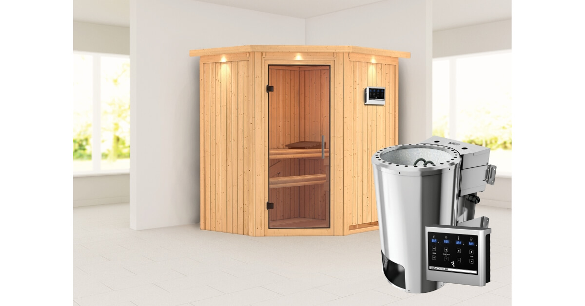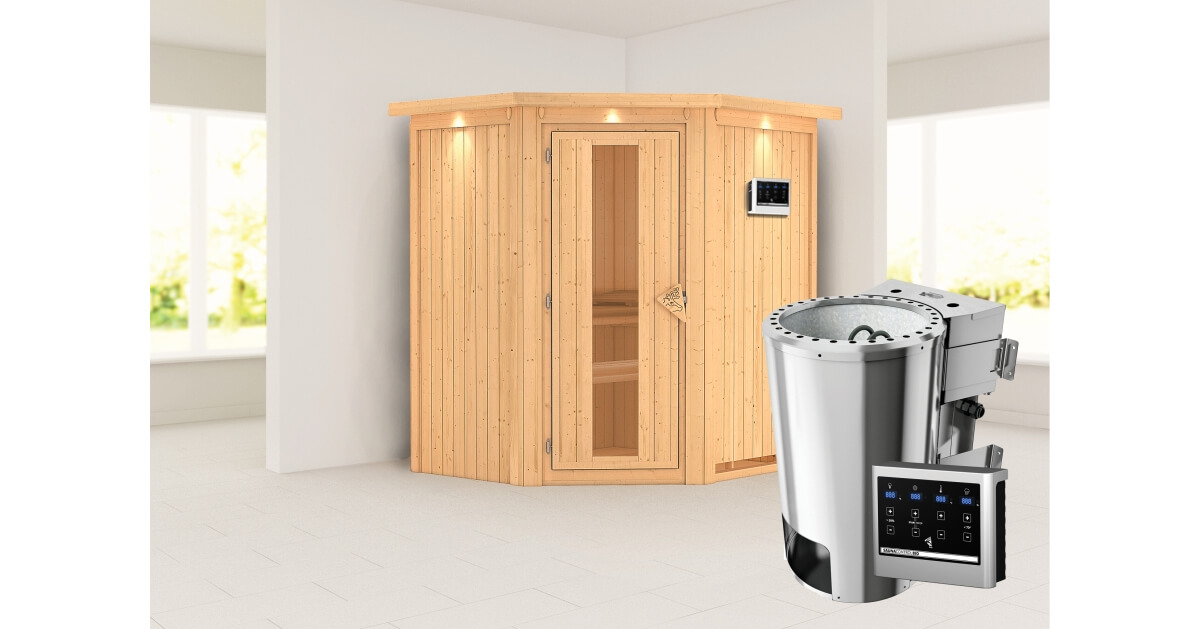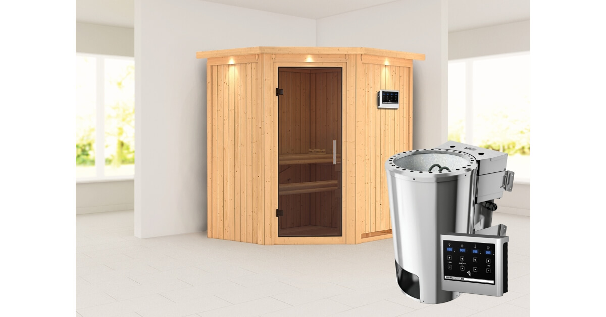 Karibu 68mm Systemsauna Tonja mit 3,6kW BIO-Kombiofen mit ext. Steuerung Easy