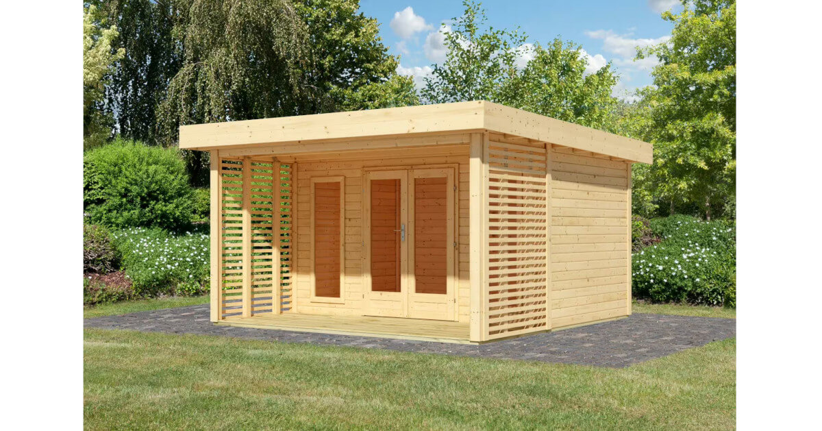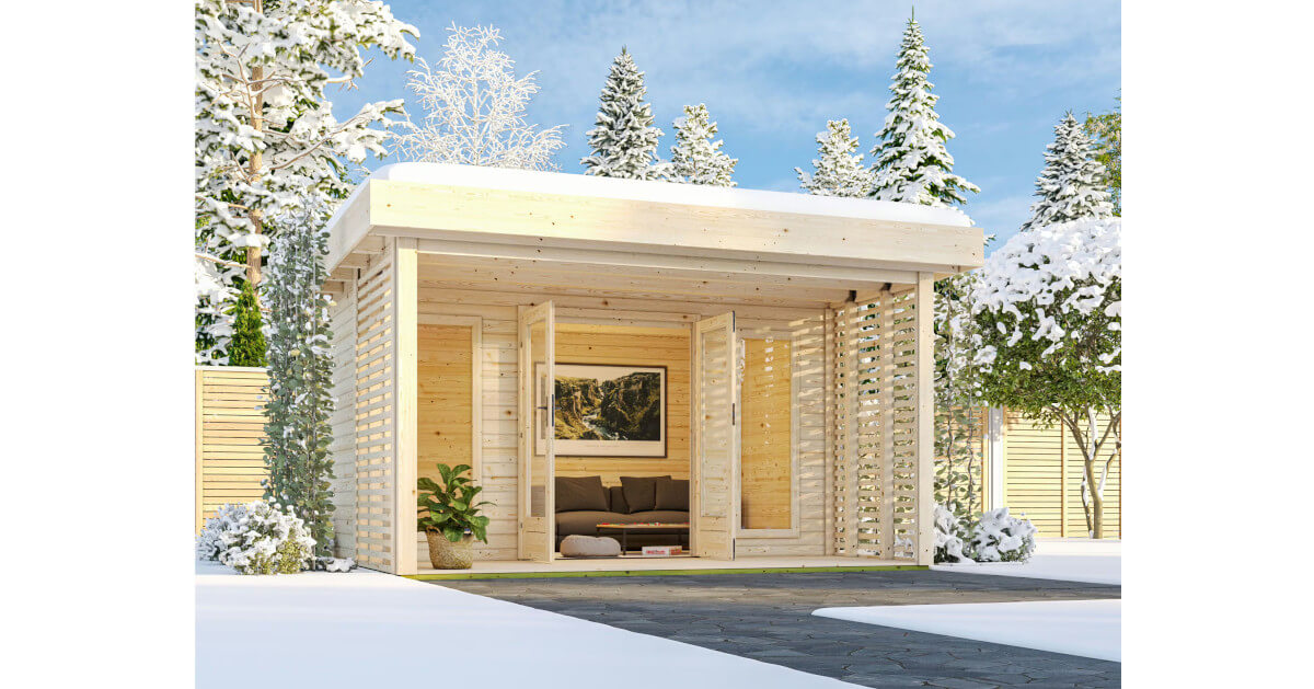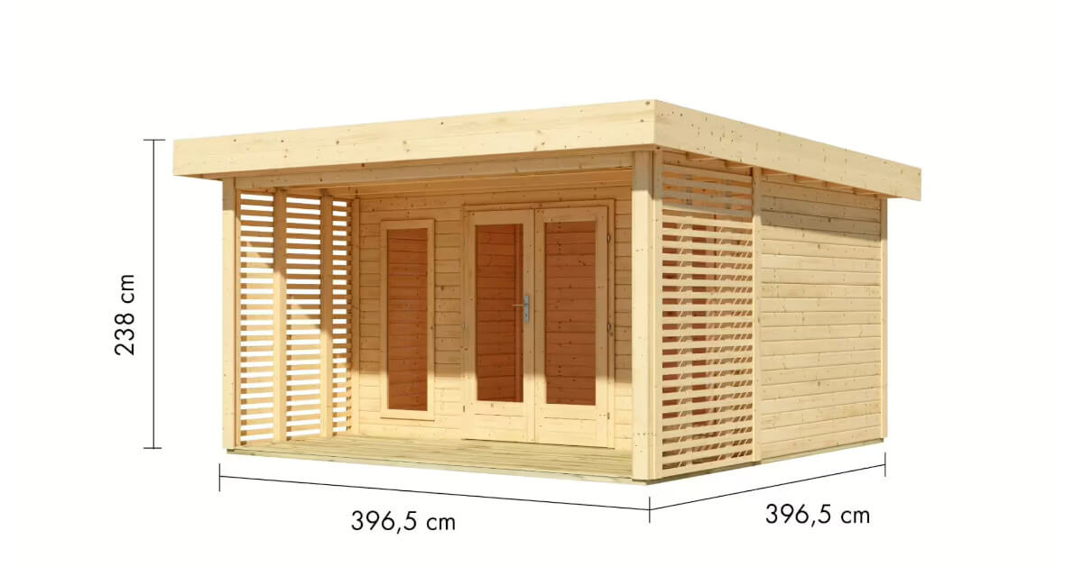 Unser Blockbohlenhaus Chione verfügt über eine besonders hohe Schneelast von 185 kg/m². Das Gartenhaus wird aus 38 mm starken Wandbrettern aus nordischer Fichte im Steck-/Schraubsystem gefertigt und gewährleistet somit einen einfachen Aufbau und eine extrem stabile Konstruktion mit doppeltem Nut- und Federbereich der Wandbretter. Das Pultdach besteht aus Massivholz. Die große 150cm tiefe Terrasse und der vordere Dachüberstand von 300 mm schützt den Eingangsbereich darüber hinaus wirkungsvoll. Die Grundfläche beträgt 15,72 qm bei einem umbauten Raum von 33,0 cbm. Mit einer Seitenhöhe von 212 cm und einer Firsthöhe von 238 cm bietet das Gartenhaus optimale Raumnutzung. Das Gartenhaus hat ein Sockelmaß von 393 cm x 393 cm. Bodenbalken sorgen für den Schutz von unten und werden unter das Gartenhaus gelegt. Durch die Kesseldruckimprägnierung der Bodenbalken sind diese vor Witterungseinflüssen und holzzersetzenden Pilzen bereits geschützt. Die praktische und vormontierte Tür sorgt mit Ihren großzügigen Abmessungen und dem Massivholzrahmen für einen einfachen Zutritt in das Gartenhaus und sichert den Inhalt nebenbei effektiv vor unbefugtem Zugriff. Die Verglasung der Lichtausschnitte sorgt für großzügigen Tageslichteinfall.