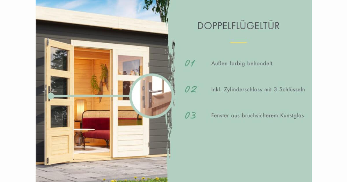 Der große Bruder des Tintrup. Benötigen Sie viel Stauraum zum Aufbewahren Ihrer Gartengeräte und Gartenmöbel? Dann ist das Gartenhaus Mattrup bestimmt die richtige Wahl. Mit einer Wandstärke von 28mm aus nordischem Fichtenholz und dem einfachen Steck-/Schraubsystem hat das Haus einen stabilen Stand und ist schnell zu montieren. Der Raum des Gartenhauses wird, wie bei seinem kleineren Bruder Tintrup, durch eine Mittelwand geteilt. Dies ermöglicht eine strukturierte Ordnung Ihrer Gegenstände. Ob als gemütlicher Raum im Garten mit kleinem Lager für Gartengeräte oder als Werkstatt mit Abstellraum für das Material und das Werkzeug, das Gartenhaus Mattrup mit einem Außenmaß von (BxT) 424x274cm bietet Ihnen viele Möglichkeiten. Das Innere wird vor unbefugtem Betreten durch eine Doppelflügel- und eine Einflügeltür mit einem Lichtausschnitt pro Türflügel und einem Buntbartschloss je Tür gesichert. Das Gartenhaus ist in der modernen Farbe terragrau oder klassisch in naturbelassenem Holz erhältlich. Somit kann das Gartenhaus auch von außen individuell gestaltet werden. Das Dach aus Massivholzbrettern kann mit einer optional erhältlichen selbstklebenden Dachfolie ausgekleidet werden und schützt das Gartenhaus von oben vor der Witterung. Schützen Sie Ihre Gartengeräte und -möbel effektiv vor der Witterung mit dem Mittelwandhaus Mattrup für mehr Struktur.