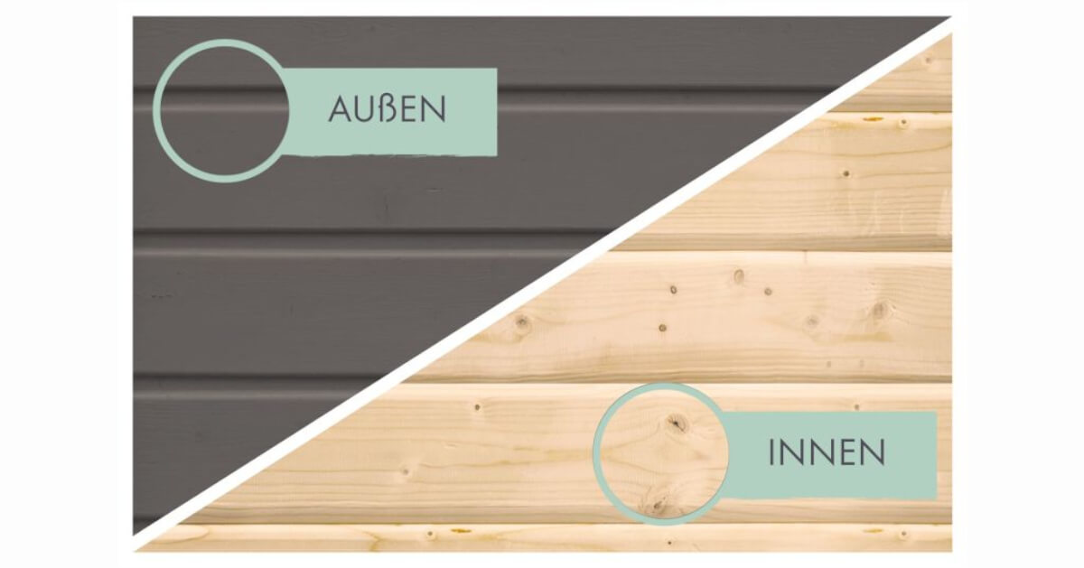 Hinweis: Die Wandinnenseiten, das Dach, der Boden und die Schnittkanten sind aus produktionstechnischen Gründen nicht endbehandelt und stellen somit einen Unterschied zur Außenseite dar. (Diese müssen nachbehandelt werden)