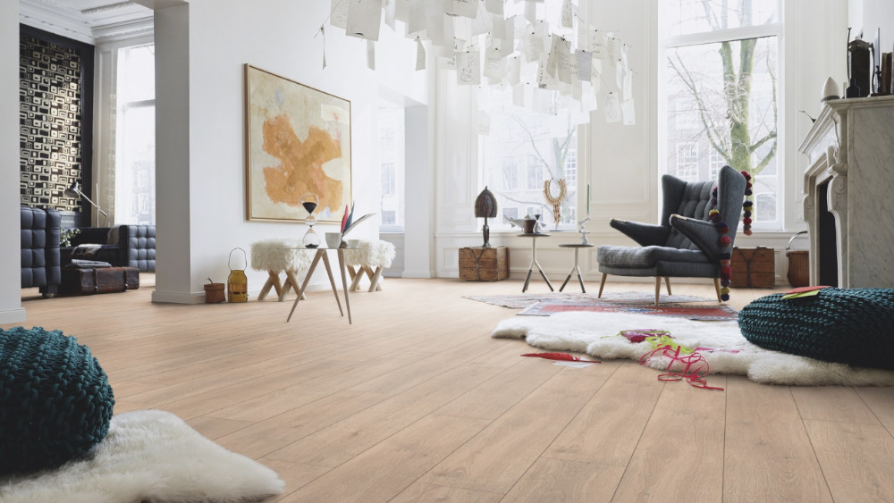 - Einfache und schnelle, leimlose Verlegung, auch auf Warmwasser-Fußbodenheizung