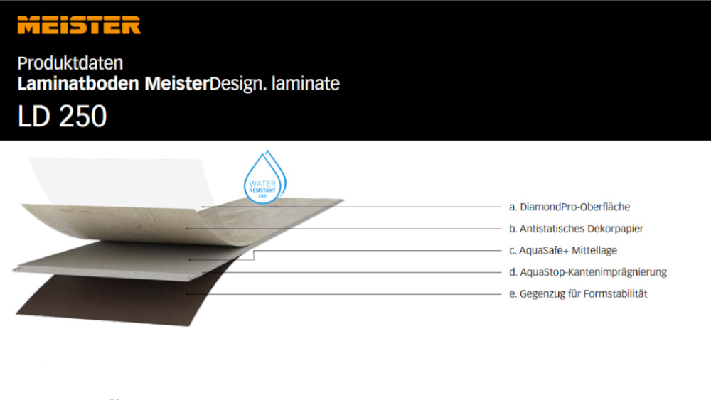 MeisterDesign. laminate LD 250 im breiten Kurzdielenformat (1288 x 244 mm) verfügt über einen besonders hohen und stabilen Produktaufbau und ist mit Nutzungsklasse 23|32 auch für zahlreiche Objektbereiche geeignet. LD 250 ist mit einer AquaStop-Kantenimprägnierung und einer AquaSafe+-Mittellage ausgerüstet und dadurch wasserresistent (24 h nach NALFA). Der Boden kann somit auch in Badezimmern verlegt werden. Die kratzresistente Diamond Pro-Oberfläche und das antistatische Dekorpapier runden die technischen Vorteile ab.