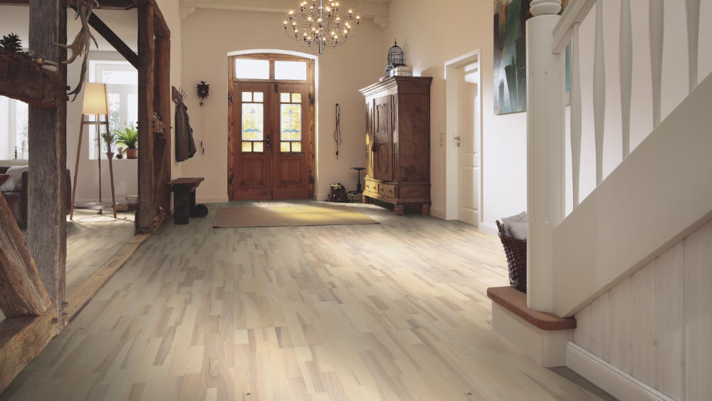 Schiffsboden ist ein ganz klassisches Erscheinungsbild eines Parketts. Dafür werden kleinere Holzabschnitte zusammengefügt, die in ihrer Gesamtheit eine abwechslungsreiche und gleichzeitig harmonisch wirkende Einheit bilden. Schiffsboden wie MeisterParkett. longlife eignet sich für alle Raumgrößen. Die Dielen gehen fugenlos ineinander über und lassen die verlegte Fläche somit besonders homogen wirken. Zusätzlich wirkt es feuchtigkeitsregulierend und sorgt für ein gesundes Raumklima.
