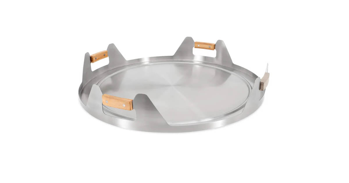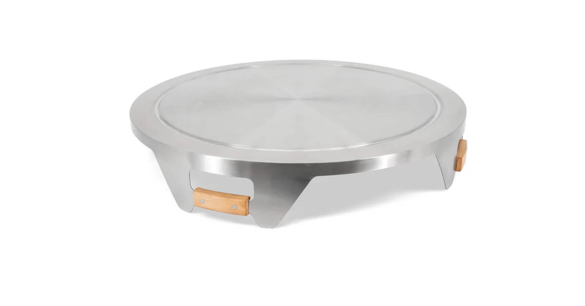 Robuster Edelstahldeckel passgenau für die Feuerschale Tyropit mit Buchenholzgriffen und praktischer Ablagefunktion.