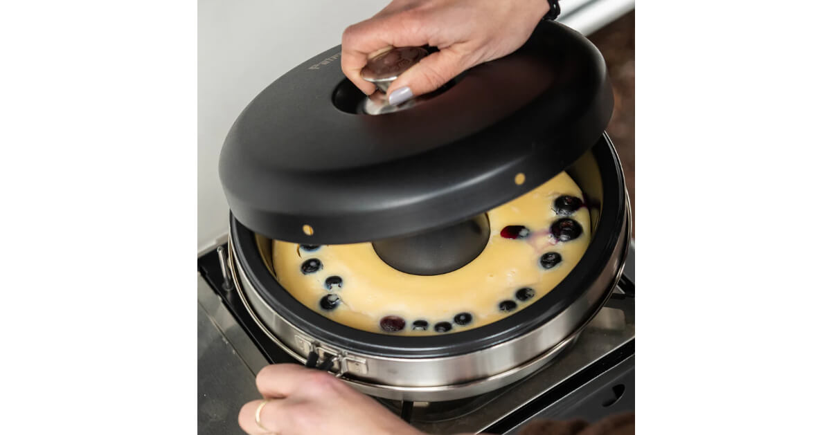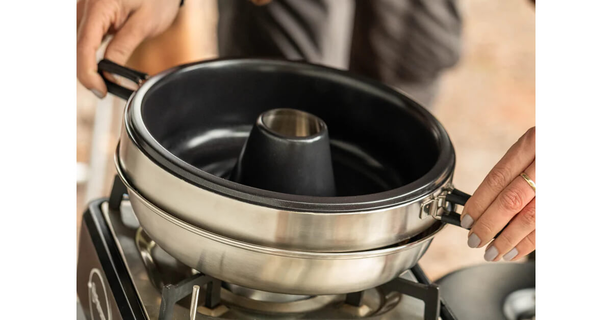 Der Camping Backofen bietet eine einzigartige Funktion mit einer dreifachen Wärmeverteilung, die Ober-, Unter- und Seitenhitze umfasst. Die Wärme steigt von der Basis in die Auflaufform und wird durch die ausgeklügelte Wärmeverteilung und die doppelwandige Konstruktion gleichmäßig aus drei verschiedenen Richtungen auf die Speisen geleitet: von oben, unten und den Seiten. Im Deckel befinden sich Ventilationsöffnungen. Die Wärme zirkuliert effizient in der Ringform, wodurch eine Vielzahl von Backofengerichten perfekt gelingt. Von mit Käse überbackenem Gemüse über frisch gebackenen Brötchen bis hin zu herzhaftem Chili con Carne – der Fantasie sind keine Grenzen gesetzt.