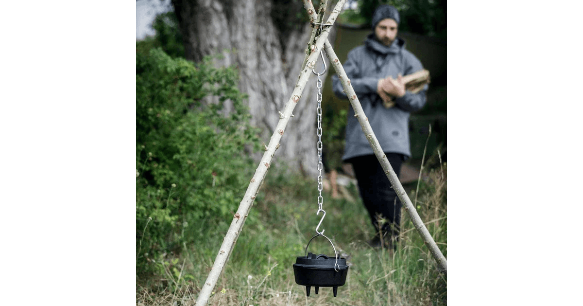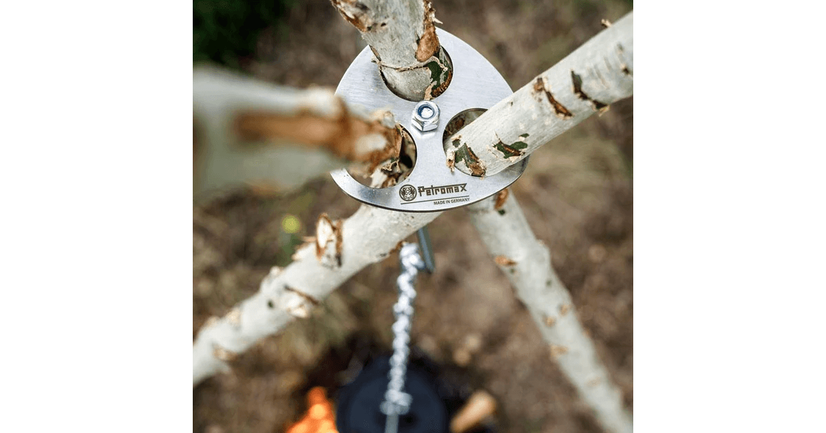 Mit dem Petromax Dreibein-Ring ist der sofortige Aufbau eines Lagerfeuers für Draußen-Kochabenteuer möglich. Drei Äste werden vom Lagerfeuer-Koch gesucht und zurechtgeschnitzt, um durch die Aussparungen des Dreibein-Rings zu passen. Anschließend wird die Feuerstelle errichtet und ein Haken befestigt, an dem ein Feuertopf oder Teekessel aufgehängt werden kann. Durch die unterschiedlich verstellbare Länge der Kette kann der Topf näher über das Feuer gehängt werden. Der Dreibein-Ring zeichnet sich durch ein geringes Packmaß aus und eignet sich z.B. auch für den Bau eines Tipis.