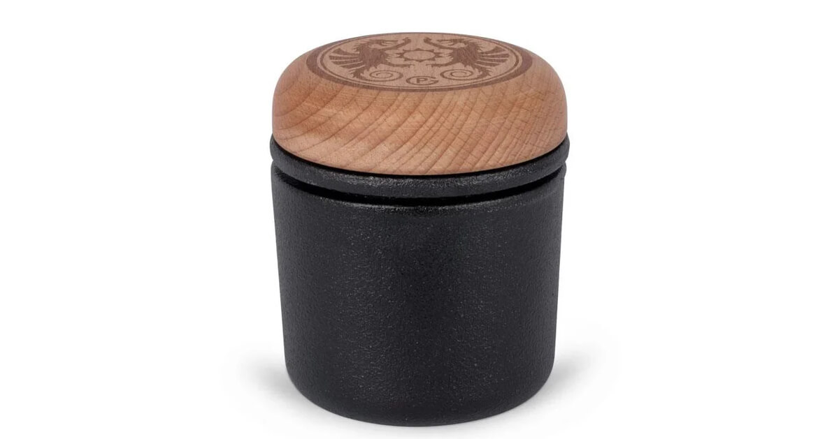 - Petromax Design: Drachenlogo auf dem Holzdeckel