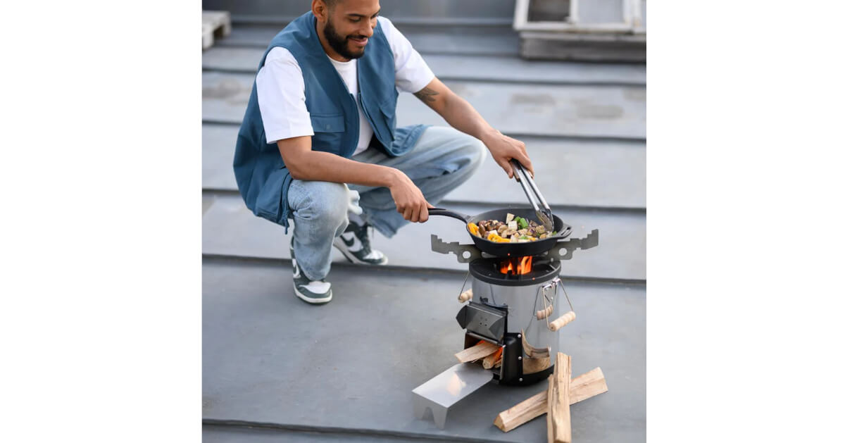 Die gusseiserne Kochfläche speichert die Hitze und verteilt sie gleichmäßig an dein Kochgeschirr. Dadurch bleiben Speisen saftig und garen gleichmäßig, während die Temperatur konstant hoch bleibt. Durch die gute Isolierung nach unten kann der Raketenofen sogar auf einem Campingtisch betrieben werden, ohne die Oberfläche zu beschädigen. Nach dem Gebrauch lässt er sich dank der stabilen Henkel bequem transportieren und platzsparend abstellen.