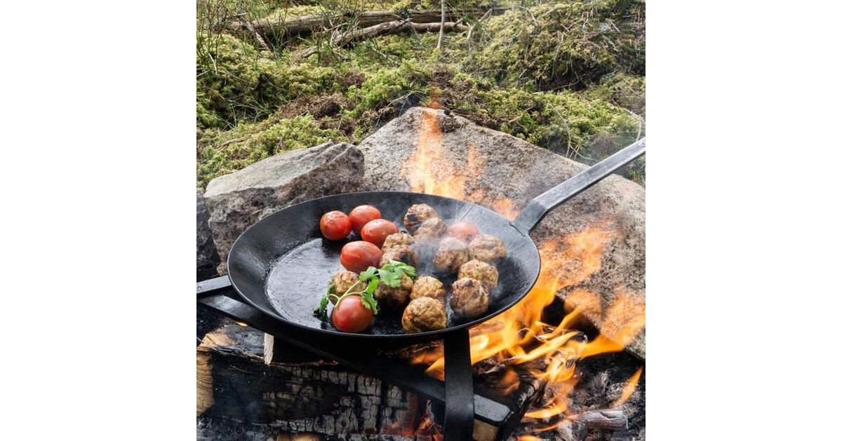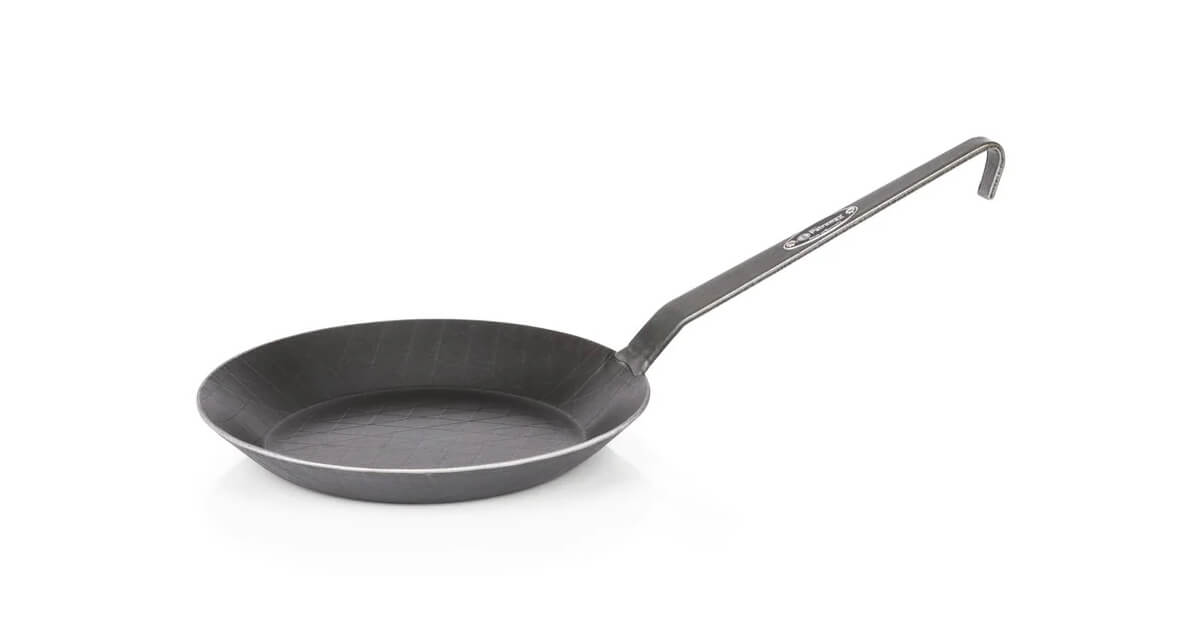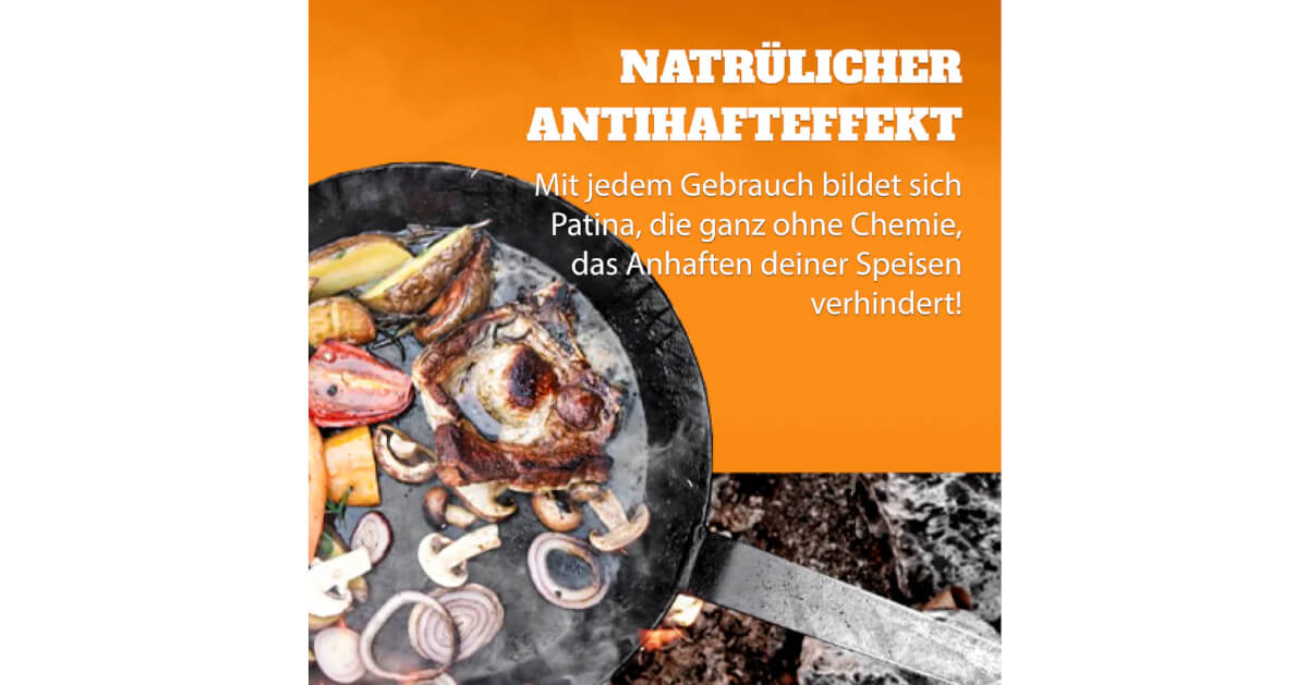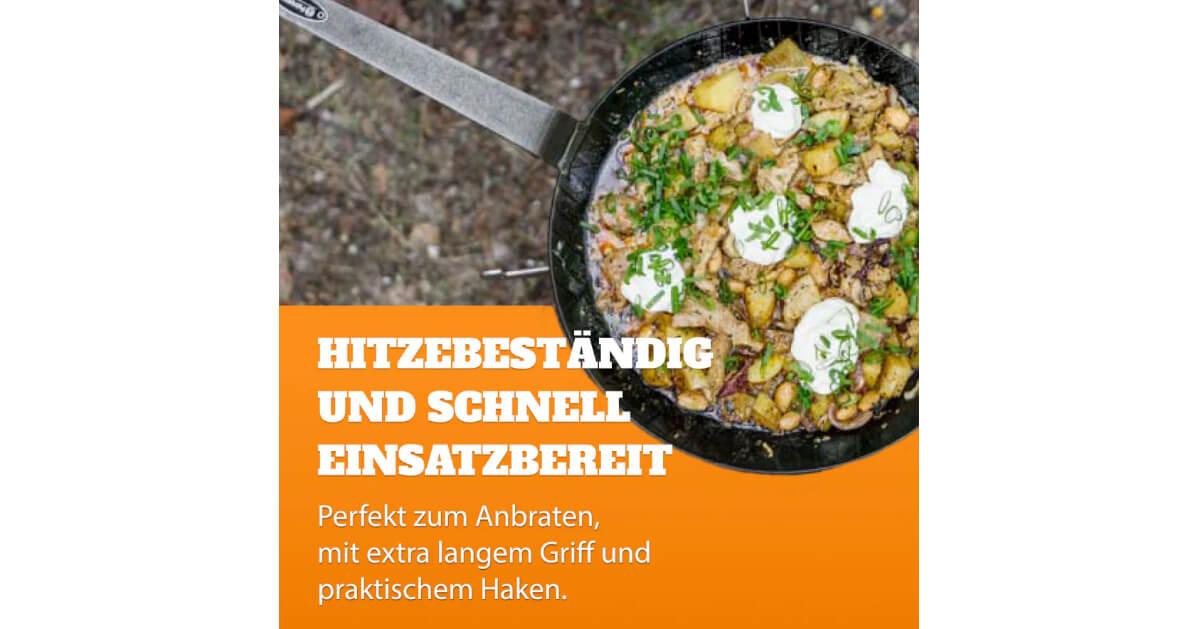 Die schmiedeeiserne Pfanne ist für alle Herdarten und das offene Feuer geeignet.
