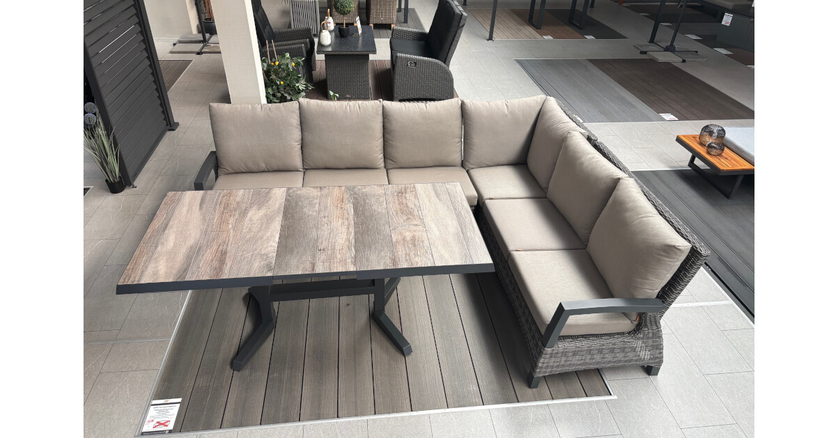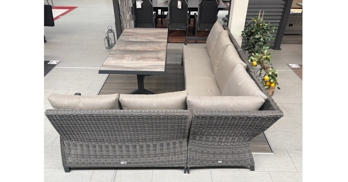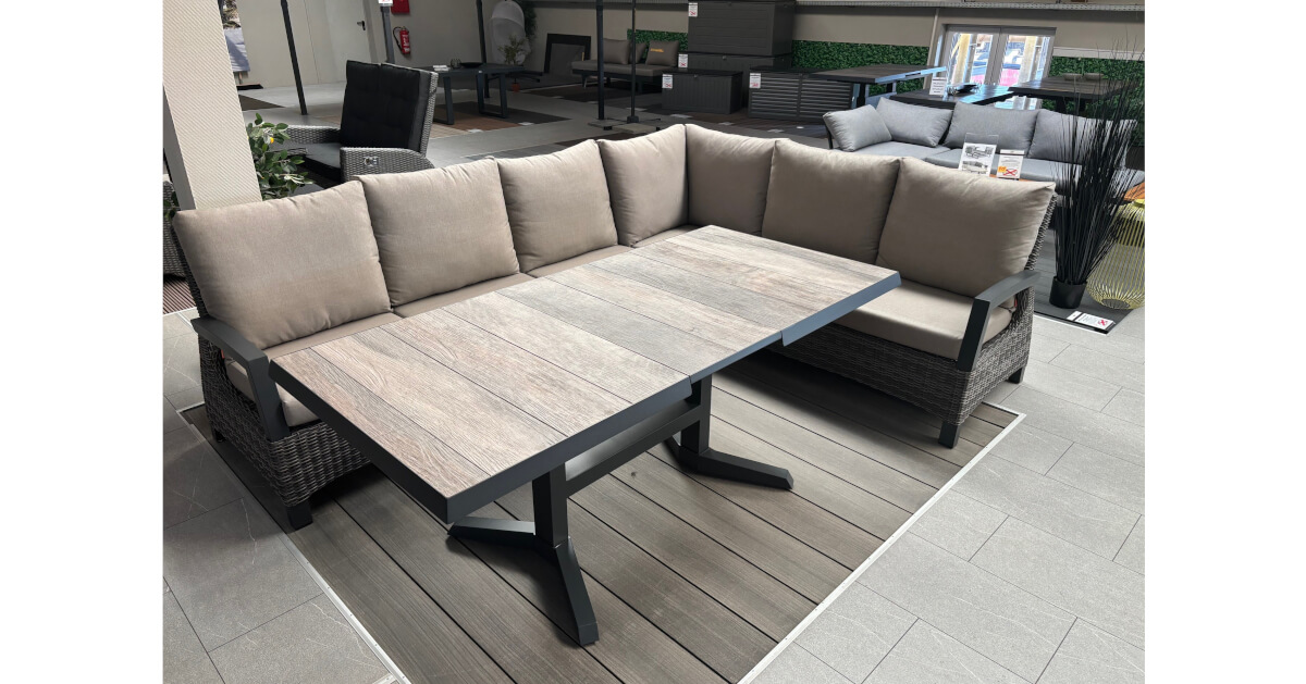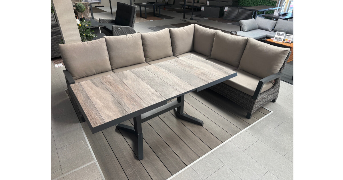 Genießen Sie den Sommer mit der perfekten Verbindung aus Stil, Komfort und Funktionalität: Die 5-teilige Ecklounge Corido kombiniert die Gemütlichkeit einer klassischen Loungegruppe mit der praktischen Funktionalität von Dining-Gartenmöbeln. Ergänzt wird sie durch den Castilla (ähnlich Talina) Lift-Ausziehtisch, der mit seiner variablen Höhe und seiner robusten, witterungsbeständigen Keramikplatte vielseitig einsetzbar ist. Gemeinsam schaffen sie eine stilvolle Outdoor-Oase für entspannte Stunden mit Familie und Freunden.