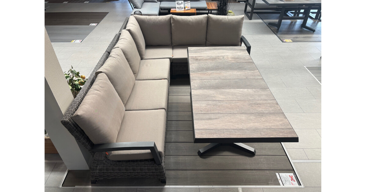 Die großzügige Sitzgruppe bietet maximalen Komfort und Flexibilität, perfekt für verschiedene Anlässe – sei es ein gemeinsames Essen oder ein entspanntes Beisammensitzen. Die durchdachte Sitzhöhe sorgt dafür, dass Mahlzeiten besonders bequem genossen werden können, während die weichen Kissen und das ergonomische Design Entspannung pur garantieren.
